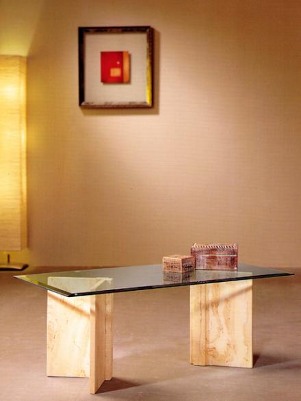 Modelo 225 Mesa de comedor, mármol travertino con tapa de cristal. Mueble auxiliar a medida.